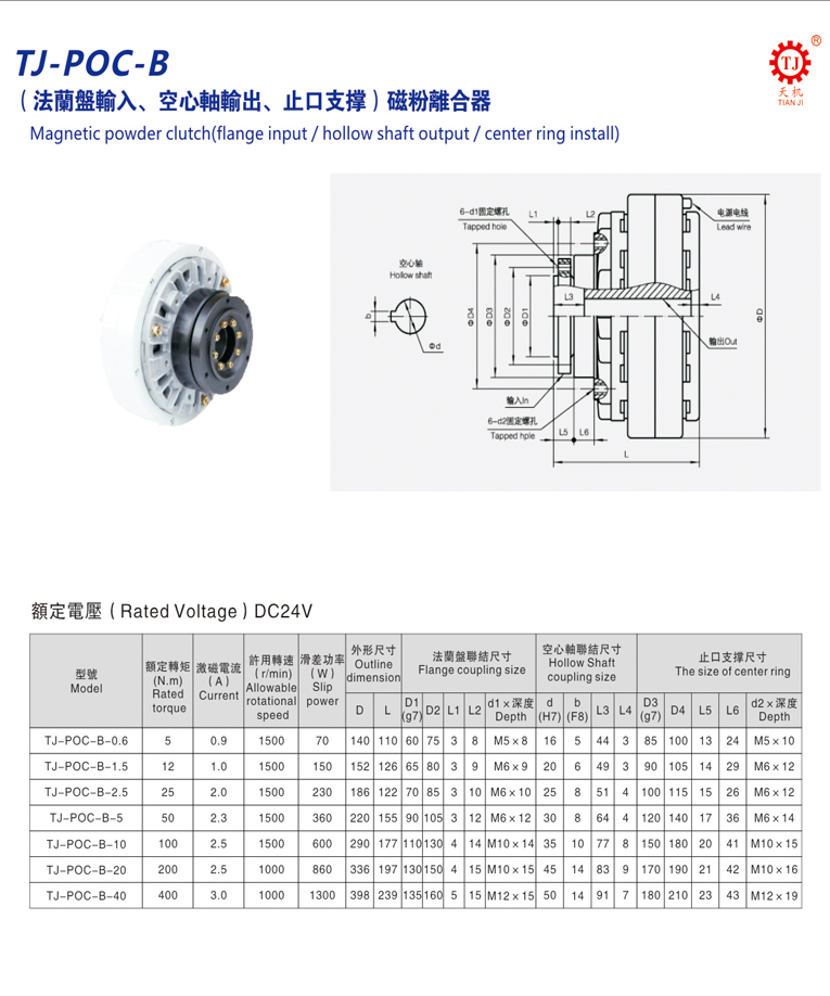 中空軸磁粉離合器(法蘭盤輸入磁粉離合器)型號為TJ-POC-B,規格有0.6KG、1.5KG、2.5KG、5KG、10KG、20KG、40KG;對應的額定轉矩為:6Nm、12Nm、25Nm、50Nm、100Nm、200Nm、400Nm等更大型號規格的轉矩,采用的都是DC24V直流電壓。