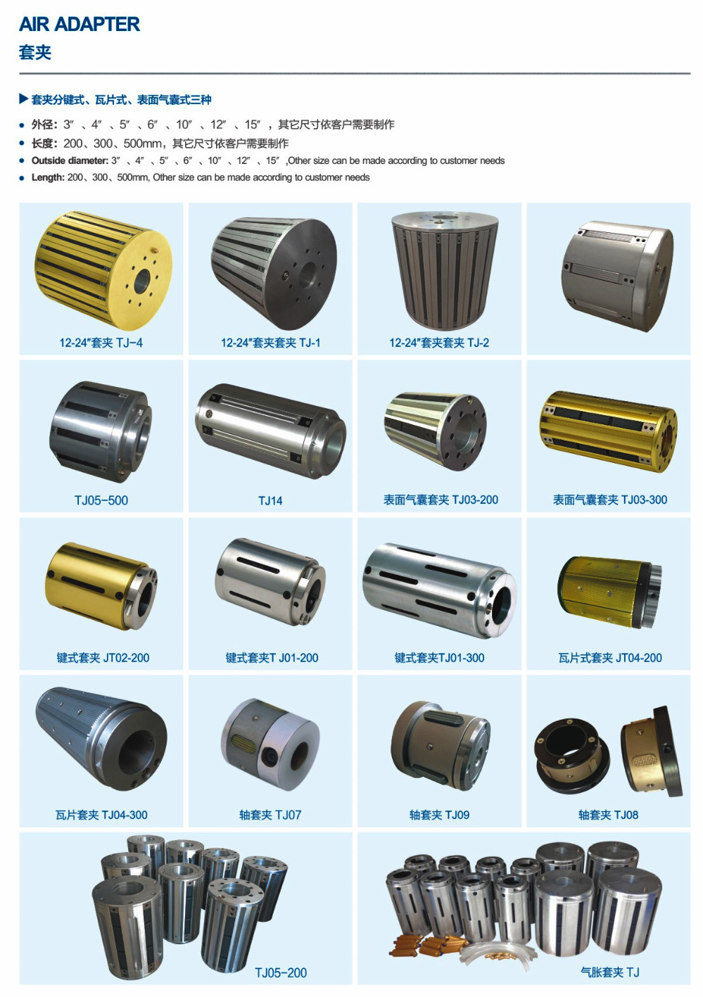 鋁合金板條式氣脹套夾,鋼制瓦片式氣脹套夾適用于涂布、分切、印刷、復(fù)卷、復(fù)合、造紙、塑料等相關(guān)機械的收放卷軸,適用于其它機械設(shè)備的有:涂布機、皮革機、定型機、壓花機、分條機、模切機、復(fù)卷機、復(fù)卷機、紙筒機、貼合機、覆膜機、吹膜機、發(fā)泡機、淋膜機、壓紋機、造紙機、無紡布機、驗布機、燙金機、電池設(shè)備等相關(guān)機械配套之使用。